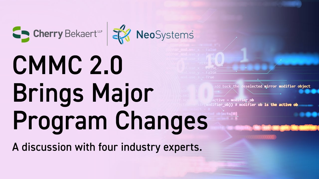 Listen to an on-demand webinar hosted by Cherry Bekaert and NeoSystems to learn about the changes to the CMMC program and what you should be doing now to prepare. Our esteemed panel representing industry, the assessor community and legal sector discuss: